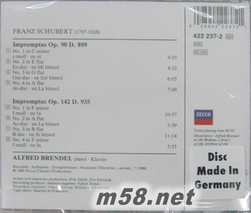 Franz Schubert (1797 - 1828) 4 Impromptus, Op.90, D.899 [1] No.1 in C minor: Allegro molto moderato [9:35] [2] No.2 in E flat: Allegro [4:32] [3] No.3 in G flat: Andante [6:05] [4] No.4 in A flat: Allegretto [7:09] 4 Impromptus Op.142, D.935 [5] No.1 in F minor: Allegro moderato [10:57] [6] No.2 in A flat: Allegretto [5:39] [7] No.3 in B flat: Theme (Andante) with Variations [11:14] [8] No.4 in F minor: Allegro scherzando [5:33