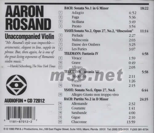 BACH TELEMANN YSAYE 無伴奏小提琴藝術(m58.net) 希伯萊的遺產小提琴家羅森演繹 發燒名碟重現江湖 被遺忘的大師畢生巔峰之作----CD圣經推薦CD片 無伴奏小提琴,對今日一味以華麗取勝的新音樂家來說已是個陌生名詞,無伴奏小提琴對演奏家是一種很高的考驗(就和清唱一樣),惟小提琴名家亞倫羅桑,繼克萊斯勒、艾爾曼及海飛茲之后,費盡窮年累月,獨自在琴房磨礪,將其雕琢馥郁馨芳的瑰木,散發著誘人的清香。 羅桑雖不曾躍登媒體頭版,但卻在樂界長年高居十大名家之列,可謂被遺忘的小提琴大師。專輯中收錄了三位名家巴哈、泰雷曼及以沙易等六首無伴奏小提琴作品,在亞倫羅桑從容優雅之姿與浸透多年的純青技藝之下,成功的攀上演繹的顛峰,無論是樂句的塑造、技巧的穩定度、音樂表情及張力均完美呈現,氣韻渾然天成。 亞倫羅桑不但做到了讓聆聽者和小提琴真正的「裸裎相見」,也真正的體會到小提琴的魅力與情感。誠如紐約時報名樂評人荀柏格贊道:「羅森之演奏風格無懈可擊」。 本片為AUDIOFUN唱片公司曆來最佳錄音之一,不僅輕易捕捉演奏每一細節,且弦音延伸良好并兼具細致與飽滿度,更襯出亞倫羅桑演奏技藝之卓然出眾及藝術性之完美。 1927年出生於美國印第安納州的小提琴家亞倫?羅桑,早年在芝加哥由易沙意學生薩梅替尼(Leon Sametini)啟蒙,之后進入寇第斯音樂院,拜在鼎鼎大名的金巴利斯特(Efrem Zimbalist)門下。金巴利斯特不但是名師奧爾的高徒,甚至在奧爾1930年去世之后,他一肩擔起教師之責,繼續指導蕭姆斯基、阿斯肯納西等,日后也都是大師級的小提琴家。羅桑學成后於1948年在紐約首演,巧合的是他的恩師金巴利斯特則在次年舉行了生涯的告別演奏會!之后羅桑以極度優美的琴音和洗練的技巧,逐漸建立起樂壇名聲,紐約時報著名樂評家荀伯格稱他為最優秀的浪漫小提琴演奏家,實恰如其分。這套巴哈無伴奏錄於1997年,羅桑全然的浪漫基調,其演奏完全沉浸於內在思考與情感之中。