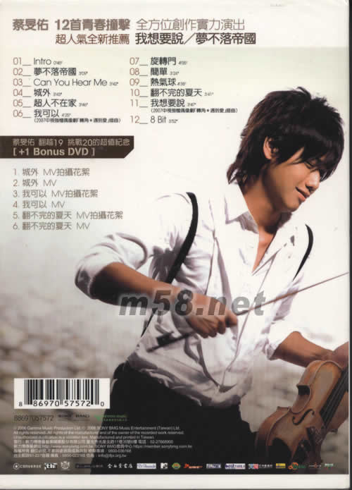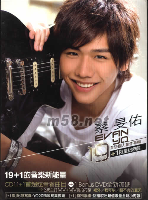 19(限量紀念版)(m58.net) 19+1的音樂新能量 CD11+1首超炫青春曲目+1 Bonus DVD全新加碼 3首主打MV+MV側拍花絮 城外/我可以/翻不完的夏天 [+1歲]紀念寫真-YO20精采寫真拉頁 [+1]特別獻禮-回饋歌迷超值限量全新小海報 歌迷票選超人氣全新推薦 『夢不落帝國』+『我想要說』 (2007中視強檔偶像劇『轉角*遇到愛』插曲) 【+1 Bonus DVD】全新加碼 蔡旻佑 翻越19 挑戰20的超值紀念 【+1歲 紀念寫真】YO20精采寫真拉頁 紀錄蔡旻佑幕前幕后花絮照片 【+1 特別獻禮】回饋歌迷超值限量全新海報(內附在專輯包裝里)