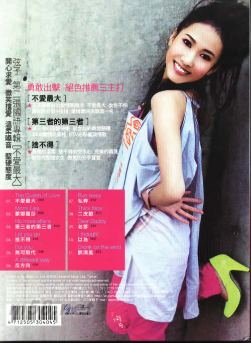 不愛最大(臺(tái)灣首版)(m58.net) 開心求愛 微笑擋愛 溫柔嗓音 堅(jiān)硬態(tài)度 純色好女生 「弦子」 勇敢晉級(jí) 愛情新座標(biāo) 11首無可取代的真青春 好音樂 勇敢出擊 絕色推薦三主打 *不愛最大 王子變青蛙的愛情黑魔法 不愛最大 女生不怕 復(fù)古阿哥哥+扭扭 愛情舞曲挑戰(zhàn)第一名 *第三者的第三者 第三者的悲傷快樂 前女友的勇敢抉擇 2008劇情式風(fēng)格 KTV必點(diǎn)催淚情歌 *捨不得 最后的溫柔 捨不得的空手心 完美的再見 新世代堅(jiān)強(qiáng)女生 微笑的分手宣言 2008 完整收錄 *醉清風(fēng) 網(wǎng)路傳唱 弦子被發(fā)掘紀(jì)念歌曲 *老爹 與迪克牛仔老爹合唱 在內(nèi)地造成轟動(dòng) 傳唱於大街小巷 *蒙娜麗莎 以為 弦子突破自我 創(chuàng)作歌曲