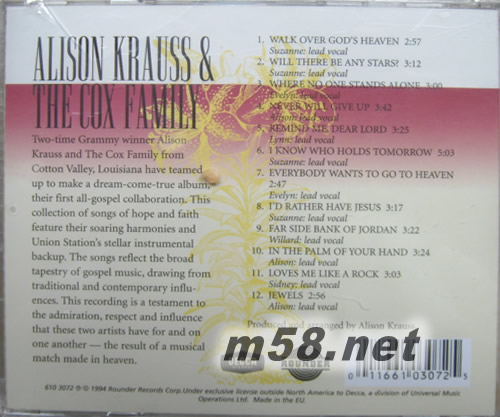 THE COX FAMILYI Know Who Holds Tomorrow(m58.net) 多次被評為世界最美的女聲 坐擁11座格萊美獎。 最著名的歌曲When you say nothing at all(永遠有多遠) 被無數(shù)人當作心中永恒的經(jīng)典。 冷山中那首動人的The Scarlet Tide的演唱者.獲得2004年奧斯卡最佳電影歌曲提名。 在和聯(lián)合車站樂隊的合作后,Union Station的Bluegrass威力又像是幫她往前推了一把,讓已經(jīng)擁有翅膀的Alison又添加一道光環(huán)。 當一位鄉(xiāng)村電臺DJ某天在節(jié)目中播放Alison精選專輯主打歌「When You Say Nothing At All」后,每天如浪潮般的點歌頻率,開啟了鄉(xiāng)村音樂的一個新傳奇。Alison在1995年與Union Station合作的精選大碟,曾是鄉(xiāng)村音樂排行榜第2名、流行音樂專輯第15名,全美銷量達二百萬張,這對于一個鄉(xiāng)村歌手而言,是相當大的數(shù)目。不過與其說專輯得到如此多的成功是個意外,不如承認Alison無可否認十分甜美的歌喉,及用心演唱的態(tài)度,才是讓她長久以來受歌迷肯定的主要原因。 16歲時,Alison Krauss(艾莉森.克羅絲)與美國鄉(xiāng)村音樂最重要的獨立唱片公司Rounder簽約,發(fā)行的第一張個人專輯,立刻成為樂評家的最愛。18歲首度獲得葛萊美獎,之后又繼續(xù)獲得無數(shù)鄉(xiāng)村音樂獎項,其中包括11項葛萊美獎,總總的榮耀應(yīng)該都是因為她從小苦學古典小提琴、民謠小提琴及歌唱技巧。 作為電影「新娘百分百」主題曲「When You Say Nothing At All」原唱者,與羅南詮釋方式不同,Alison溫柔舒服的唱腔,搭配著吉他和鋼琴伴奏,簡單又令人感動不已;樂評家均認為AKUS(Alison Krauss and Union Station)從80年代末至90年代中,將草根藍調(diào)音樂從地方性音樂帶領(lǐng)成為全世界均能接受的樂風,在樂壇占有舉足輕重的地位。 1999年,Alison Krauss的專輯《Forget About It》成為金唱片。一年后,她因在《O Brother ,Where Art You》電影原聲專輯中的出色表現(xiàn)而再度引起人們關(guān)注,她也因此而成為自Bill Monroe之后,又一位從肯塔基西部群山中突現(xiàn)的藍草歌手。不論在藍草音樂領(lǐng)域還是鄉(xiāng)村主流音樂領(lǐng)域,Alison Krauss和她的樂隊Union Station在過去一年中的出色表現(xiàn)都是不容忽視的。除了在原聲專輯中的合作,他們還同Kenny Rogers等老鄉(xiāng)村歌手和傳統(tǒng)藍草音樂歌手錄制作品。 Alison Krauss 是當今美國藍草音樂的領(lǐng)軍者,“藍草音樂”(Blue Grass)是美國民間音樂的一種,從上世紀二十年代出現(xiàn)并開始發(fā)展,在新世紀里未顯絲毫頹敗之勢,因Alison 這樣優(yōu)秀蘭草歌手的不斷革新,使蘭草音樂煥發(fā)出更為迷人的氣質(zhì),作品逐漸擠占主流唱片市場份額,且在全球都擁有越來越多的歌迷。 Alison的歌曲之所以吸引人是因其個人演唱魅力和她所創(chuàng)作的精致、純正的蘭草音樂。Alison的歌曲中使用的樂器依然是小提琴、曼陀鈴、木吉他和斑鳩琴這樣蘭草的標準樂器,編曲配器也絕少矯飾,沒有任何世俗渲染的音樂配上Alison Krauss清泉般透徹的歌聲,使得蘭草音樂愈加發(fā)揚光大。 聽Alison Krauss唱歌,恍如清晨站在草原上,輕風拂在臉上,和煦的陽光照在身上,抬起頭,看藍天上白云悠然而過…… 《Let Me Touch You For A while》、等曲子反復聽幾十遍,還是覺得時間過得太快。孤獨,而且最好有點寂寞的時候適合欣賞Alison Krauss,無論內(nèi)心還是環(huán)境,都異常安靜Alison Krauss 單薄而清亮的歌聲,時而歡喜昂揚,時而抑郁低吟,很簡單的音樂,很平實地唱著生活中的點點滴滴。這是一種不慍不火,溫暖卻憂郁,柔美又堅強的感動,一種舒服得令人想掉淚的感動。