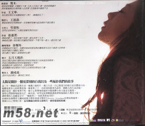 太陽(臺灣版)(m58.net) 花的三部曲之二 太陽 從不受外界影響, 她一直用她自己的步伐、 她自己的姿態,書寫她的生命。 她用作品同步了生命, 花的姿態這個主題正是她的思考, 從來不曾停止夢想也不改初衷, 她將繼續寧靜向前 陳綺貞的第五張作品,絕對值得您珍藏。