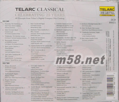 Telarc Celebrating 25 Years Telarc 25周年慶典合輯(m58.net) 當今美國發燒唱片龍頭老大Telarc公司,是1977年由一張以超級大炮為號召的《1812年序曲》LP唱片轟動全球起家,然后發展到現今的扎實規模。那張LP唱片由于大炮聲動態超強,溝紋彎彎曲曲極為古怪壯觀,曾經讓許多玩家的珍貴唱頭過不了關而報銷。 盡管最先進錄音技術一直是Telarc產品的標桿,但是他們也堅持科技必須為藝術服務,因此所灌錄的唱片,內容水準非常高,曾經贏得36項格萊美獎,至于法國唱片大獎、金音叉大獎、日本“年度最佳唱片”和德國“年度最佳發燒CD”的榮寵,更不在話下。 這套《Telarc25周年古典慶典》紀念盤,一共收錄Telarc過往出品中的40首精華片段,播放時間長達155分鐘,其中包括音響迷贊不絕口的《1812年序曲》大炮聲,《圖畫展覽會》的爆棚結尾,《查拉圖斯特拉如是說》的威猛開頭等名作,最后則以數段效果犀利的DSD錄音來結束。高科技發燒錄音的輝煌史盡在其中!