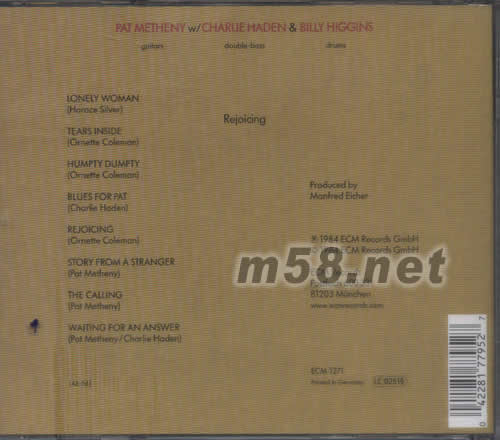 REJOICEING(m58.net) 還是一個十幾歲的孩子的時候,Pat Metheny就已經用他的方式改寫了許多爵士教材.許多年齡大他一倍的樂手都來學習他改編的教材.幾十年來,他使人感覺到異樣的熱情和旺盛的藝術青春,在他的樂隊專輯銷量百萬張的同時,他還和許多不同風格的藝術家合作,包括Gary Burton、Ornette Coleman、Jim Hall、Charlie Haden、Dave Holland、Derek Bailey等等.他的風格涉及之廣是無人能及的,可以用老少皆宜來形容.