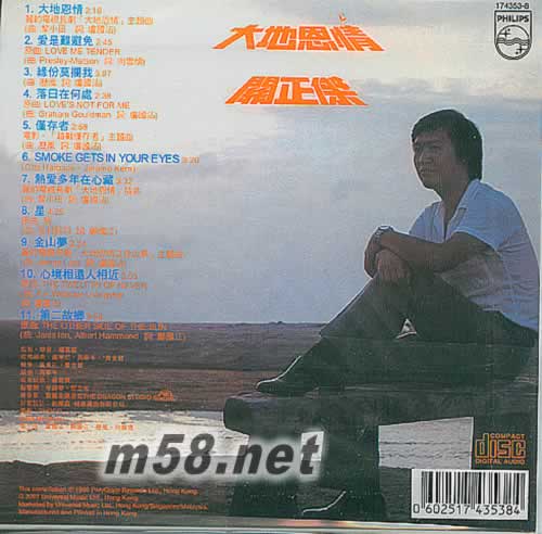01. 大地恩情 -麗的電視長劇[大地恩情]主題曲 02. 愛是難避免 -原曲:LOVE ME TENDER 03. 緣份莫攔我 04. 落日在何處 05. 僅存者 -電影[越戰僅存者]主題曲 06. SMOKE GETS IN YOUR EYES 07. 熱愛多年在心藏 -麗的電視長劇[大地恩情]插曲 08. 星 -原曲:昂 09. 金山夢 -麗的電視長劇[大地恩情之金山夢]主題曲 10. 心境相遠人相近 -原曲:THE TWELFTH OF NEVER 11. 第二故鄉 -原曲:THE OTHER SIDE OF THE SUN