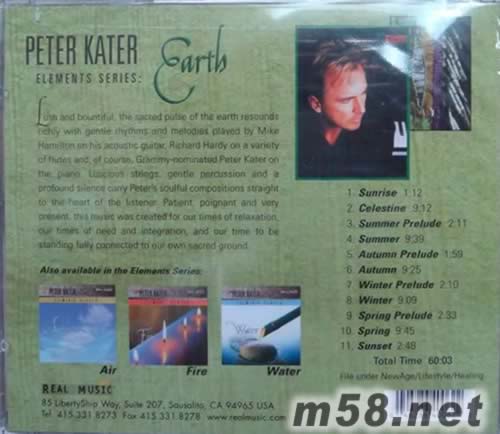 EARTH 土之樂章 笛 吉它 薩克斯 新世紀純音樂(m58.net) 本專輯REAL唱片公司官方試聽網址:片段 http://www.realmusic.com/shop/element-series-earth/prod_118.html 鋼琴大師PETER KATER,以土地及地球為主題,創作出11首鋼琴作品,跨地球早晚日出日落,春夏秋冬四季之轉變以音樂方式活靈活現地表現出來,加上竹笛、北美豎笛及昔士風及結他伴奏,是張不可錯過的音樂大碟