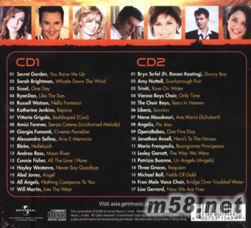 CD 1 1. You Raise Me Up - Secret Garden, Brian Kennedy & Tracy Campbell-Nation 2. Whistle Down The Wind - Sarah Brightman 3. One Day - Sissel 4. Like The Sun - RyanDan 5. Nella Fantasia - Russell Watson & The Metro Voices 6. Rejoice - Katherine Jenkins 7. Bedshaped (Cosi) - Vittorio Grigolo 8. Senza Catene - Amici Forever 9. Cinema Paradiso - Giorgia Fumanti 10. Aria E Memoria - Alessandro Safina 11. Hallelujah - Blake 12. Moonriver - Andrea Ross 13. All The Love I Have - Connie Fisher 14. Never Say Goodbye - Hayley Westenra 15. Angel - Aled Jones 16. Nothing Compares To You - All Angels 17. Into the West - Will Martin CD 2 1. Danny Boy - Bryn Terfel 2. Scarborough Fair - Amy Nuttall 3. Rose on Water - Triniti 4. Only Time - Vienna Choir Boys 5. Tears in Heaven - The Choir Boys 6. Sanctus - Libera 7. Ave Maria (Schubert) - Nana Mouskouri 8. Pie Jesu - Angelis 9. One Fine Day - OperaBabes 10. Here's to the Heroes - Jonathan Ansell 11. Buongiorno Principessa - Mario Frangoulis 12. The Way We Were - Lesley Garrett 13. Un Angelo - Patrizio Buanne 14. Requiem - Three Graces 15. Fields of Gold - Michael Ball 16. Bridge Over Troubled Water - Fron Male Voice Choir 17. Now We Are Free - Lisa Gerrard