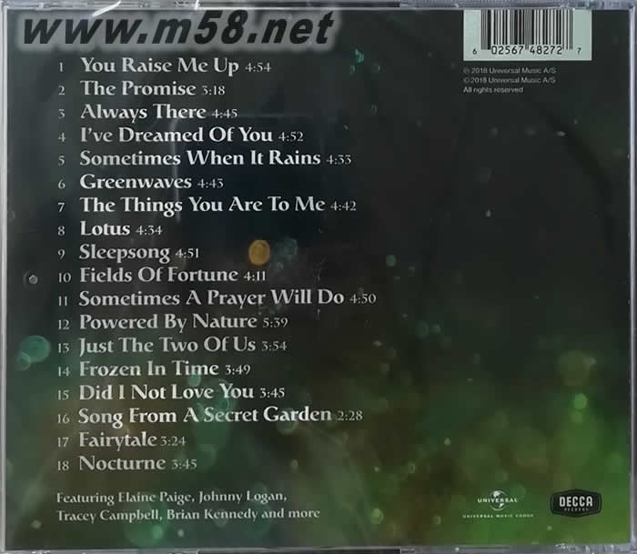 You Raise Me Up – Collection 你鼓舞了我-絕美精選(m58.net) 18首最動(dòng)人的音樂與演唱,成立25年紀(jì)念發(fā)行 ☆獻(xiàn)唱歌手 : 包括強(qiáng)尼‧羅根、著名音樂劇名伶伊蓮‧佩姬與福音女歌手Tracey Campbell 等人 「祕(mì)密花園」是一支由挪威作曲兼鍵盤手羅夫與愛爾蘭小提琴手菲昂紐奧拉組成的新世紀(jì)音樂風(fēng)格團(tuán)體。1994年成立并且於次年在歐洲歌唱大賽獲得冠軍以來,融合愛爾蘭空靈飄渺以及挪威民族音樂與古典音樂的樂風(fēng)一直深受世界各地樂迷的喜愛。專輯在全球的總銷售量已經(jīng)超過數(shù)百萬張,總計(jì)獲得113張白金唱片。 這張絕美經(jīng)選專輯收錄多首「祕(mì)密花園」最受喜愛的音樂,像是讓他們?cè)跉W洲歌唱大賽奪冠的《夜曲》、被翻唱已經(jīng)超過上百次,出現(xiàn)上千種版本、以四十種語言演唱。這次他們重新諍釋三首作品,包括21世紀(jì)最受歡迎的歌曲《你鼓舞了我》、芭芭拉‧史翠珊把演奏曲《Heartstrings》填詞后在自己婚禮上使用的歌曲《I’ve Dreamed Of You》、以及首次以鋼琴重新諍釋后的《祕(mì)密花園之歌》。 在專輯中獻(xiàn)聲的歌手有唯一兩度在歐洲歌唱大賽奪魁的愛爾蘭歌手強(qiáng)尼‧羅根、英國歌手、演員與著名音樂劇名伶伊蓮‧佩姬、福音女歌手Tracey Campbell、蘇格蘭「雷鳥樂團(tuán)」主唱?jiǎng)P倫麥特森。 ✽全新錄音與未發(fā)表版本