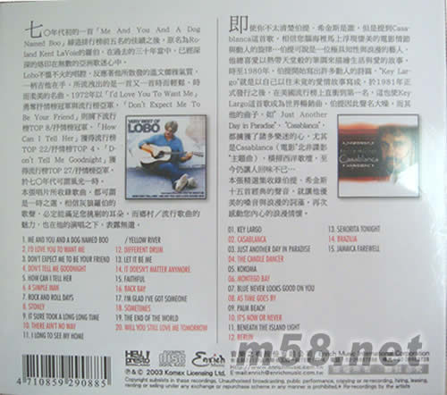 價格為估,以實到貨為準! LOBO羅伯西洋巨星回憶錄(m58.net) 七0年代初的一首[ME AND YOU AND A DOG NAMED BOO] 締造排行榜前五名的佳績之后,原名為RO-LAND KENT LAROIE的羅伯,在過去的三十年當中,已經深深的烙印在無數的亞洲歌迷心中. lobo不溫不火的唱腔,反應他所散發的溫文儒雅氣質,本柄吉它在手,所流淌出來的是一首又一首時而輕松,時而柔美的名曲,1972年以[I'D LOVE YOU TO WANT ME]勇奪抒情榜冠軍與流行榜亞軍.[DON'T EXPECT MW TO BE YOUR FRIEND]則摘下流行榜TOP 8/抒情冠軍.[HOW CAN I TELL HER ]獲得流行榜TOP 22/抒情TOP 4[DON'T TELL ME GOODNIGHT]獲得流行榜 TOP 27/抒情亞軍,于七0的代可謂是風光一時,本張唱片所收錄歌曲,都可謂是一進之選,相信灰狼羅伯的歌聲,必定能滿足您挑剔的耳朵,而鄉/流行歌曲的魅力,也在他的演唱之下,表露無遺. 即使你不太清楚伯提,希金斯是誰,但是提到Casablanca這首歌,相信您腦海里馬上會浮現懷美凄美的電影情節與動的旋律,伯提可說是一位具知性與浪漫的藝人,他總喜愛熱帶天堂般的筆調來描繪生活與愛的故事.時至1980圻,伯提開始寫出許多動人的詩篇"Key largo"就是自己以往未竟的愛情故事現寫成,于1981年正式發行,之后,在美國流行榜上直到第一名,這也使Keylargo這首哥成為世界暢銷曲,伯提因此名聲大哭噪.而其他的曲子,如"Just Another Day in paradies","Casablanca",都獲得了諸多樂迷的心,尤其是Casablabca(電影"北非諜影"主題曲).橫掃西洋歌壇,至今讓人回味不已. 本張精選集收錄伯提,希金斯十王首經典的聲音,就讓他優美的嗓音與浪漫的詞藻,再次感動您內心的浪漫情懷.