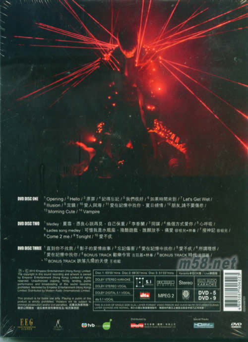 DVD 1 01. Hello 02. 原罪 03. 記得忘記 04. 我們很好 05. 如果時間來到 06. Let's Get Wet 07. Illusion 08. 定鏡 09. 愛人與海 10. 愛在記憶中找你+ 夏日傾情 11. 朋友,請不要傷悲 12. Morning Cute 13. Vampire DVD 2 01. Medley : 夏雪/憑良心說再見/自己保重 02. 李香蘭 03. 同謀 04. 換個方式愛你 05. 心呼吸 06. Ladies Song Medley : 可惜我是水瓶座/殘酷游戲/誰愿放手/痛愛 (容祖兒+林峰) 07. 搜神記 (容祖兒) 08. Come 2 Me 09. Tonight 10. 愛不疚 DVD 3 01. 直到你不找我 02. 影子的愛情故事 03. 忘記傷害 04. 愛在記憶中找你 05. 愛不疚 06. 所謂理想 07. 愛在記憶中找你 Bonus Track : 01. 歡樂今宵(古巨基+林峰) 02. 時代 (古巨基) 03. 跌落凡間的天使(王祖藍)