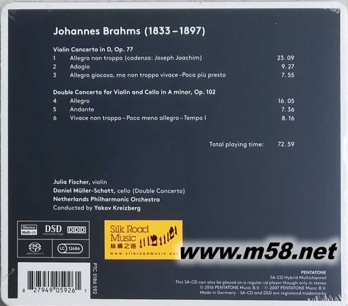 布拉姆斯:小提琴協奏曲/雙協奏曲](Brahms: Violin Concerto Double Concerto 小提琴與大提琴 SACD (劉漢盛推介 超越巔峰200擊入圍CD)(m58.net) Julia Fischer (violin)、 Daniel Müller-Schott (cello)、 Yakov Kreizberg (conductor)、 Netherlands Philharmonic Orchestra 1. 德國著名小提琴家茱莉亞•費歇爾(Julia Fischer)與美籍 俄羅斯裔知名指揮雅科夫•克瑞茲貝格(Yakov Kreizberg) 合作良久,配合荷蘭愛樂樂團將布拉姆斯的小提琴協奏曲 每一個細節的演繹都充滿節奏和戲劇性,熾熱但不浮躁, 內斂卻輕快抒情。 2.才華橫溢的德國年輕大提琴家丹尼爾•穆勒-肖特(Daniel Müller-Schott)演奏有若柔絲般的順滑,優雅別致,與費歇 爾配合得天衣無縫,說服力十足。 3. 專輯獲得"留聲機音樂雜誌(Gramophone Magazine)"、 "英國廣播公司音樂雜誌(BBC Music Magazine)"及"星期日泰晤士報(Sunday Times)"著文全力推薦。