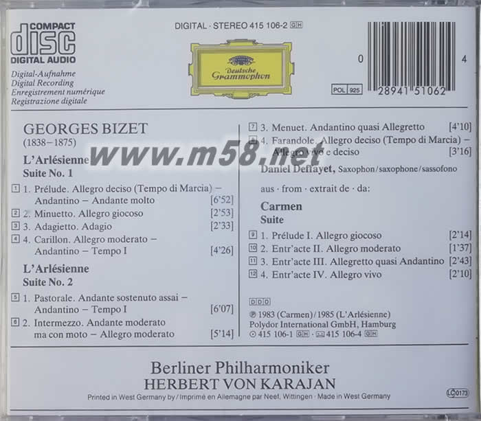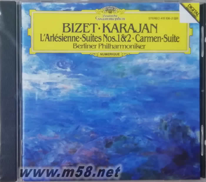比才:灰姑娘組曲&卡門組曲 Bizet:L’Arlesienne Suiten Nos. 1+ 2& Carmen Suite No.1(m58.net) 指揮家 : 卡拉揚 Karajan 比才:阿萊城姑娘組曲第一、二號、卡門組曲第一號 ◎ 卡拉揚指揮柏林愛樂管弦樂曲 藝術的創作天才經常命短,莫札特或比才就是死於創作力旺盛的最佳例子。比才的音樂多采多姿,炫燿奪目的管弦樂以外,又多了一份異國情調。擅長雄勁動容語法的卡拉揚,在這個詮釋中再次發揮高度感染力,讓人從頭至尾絲毫沒有鬆懈感。