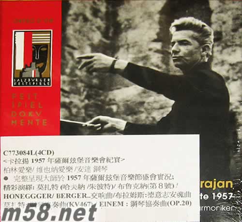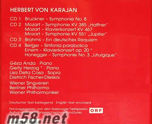 HERBERT VON KARAJAN CD 1 Bruckner-symphonie no.8 CD 2 Mozart-symphonie kv 385"haffner" Mozart-klavierkonzert kv 467 Mozart-symphonie kv 551 "jupiter" CD 3 Brahms-ein deutsches requiem CD 4 Berger-sinfonia parabolica Einem-klavierkonzert op 20 Honegger-symphonie no.3"liturgique"