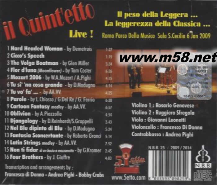 il Quint'etto Live 鬼馬五重奏 (1)(m58.net) ROSARIO GENOVESE violin RUGGIERO SFREGOLA violin GIOVANNI LEONETTI viola FRANCESCO DI DONNA cello ANDREA PIGHI double bass 創意爆棚的義式幽默 , 巴閉玩轉16首古典/卡通/爵士金曲 現埸氣氛熾熱 音效駭人 試音最佳利器 STR57909鬼馬五重奏 (2) 同步上市 意大利原裝進口