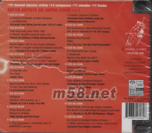 SUPER ARTISTS ON SUPER AUDIO VOL.4 最強精選SACD天碟第四輯(m58.net) 可在所有CD機器播放 最強精選SACD天碟 第四輯 收錄十七首不同試機SACD試機專用示范曲目.包括最新(CHANNEL OF CHINA)系列精選樂曲、雙簧管、魯特琴、合唱曲、小提琴、鋼琴、四重奏、管弦樂團演奏曲等不同音樂類型