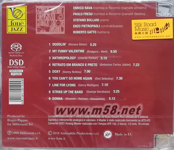 切特的色彩Shades of Chet SACD(m58.net) Enrico Rava, tromba e flicorno (canale sinistro) Paolo Fresu, tromba e flicorno (canale destro)、 Stefano Bollani (piano)、Enzo Pietropaoli, contrabbasso)、 Roberto Gatto (batteria) 1. 恩里科.拉瓦(Enrico Rava)是意大利傳奇的小號演奏家,他在國際爵士樂壇的地位跟切特.貝克(Chet Baker)不相伯仲,其吹奏小號的魔力顛倒一眾樂迷。 2. 天才橫溢的小號/富呂號(flügelhorn)演奏家保羅.弗蘇(Paolo Fresu)從11歲時便在卡利亞里音樂學院(Conservatory of Cagliari)受到音樂大師莫蘭迪尼(Enzo Morandini)的指導,除了演奏出色外,他亦是著名的編曲和作曲家,是爵士樂的殿堂級人物。 3. 拉瓦和弗蘇對切特.貝克推崇備致,他們聯同以演奏古典樂和爵士樂的米蘭著名鋼琴家斯特瓦諾.伯拉尼 (StefanoBollani),曾獲得意大利最具權威的“音樂雜志“(Musica Magazine)頒發之【最佳意大利爵士樂隊(Best Italian Group)】的低音大提琴手恩佐.彼特奧保尼(Enzo Pietropaoli)和出生于羅馬之著名爵士樂鼓手羅伯托.加托(Roberto Gatto)𢹂手演奏所有貝克的著名作品及其喜愛之歌曲,無論演奏風格、情調和樂風跟貝克在其黃金的五十年代時相若,動聽非常。 4. 此專輯由錄音大師里茲(Giulio Cesare Ricci)以最精巧的器材及其高超的錄音技術錄制貝克的不朽名曲,其精彩處非筆墨所能形容,首次以SACD為載體,音色溫潤平𧗾,音質清晰順滑,韻味十足的演奏,塑造出爵士樂品味經典。