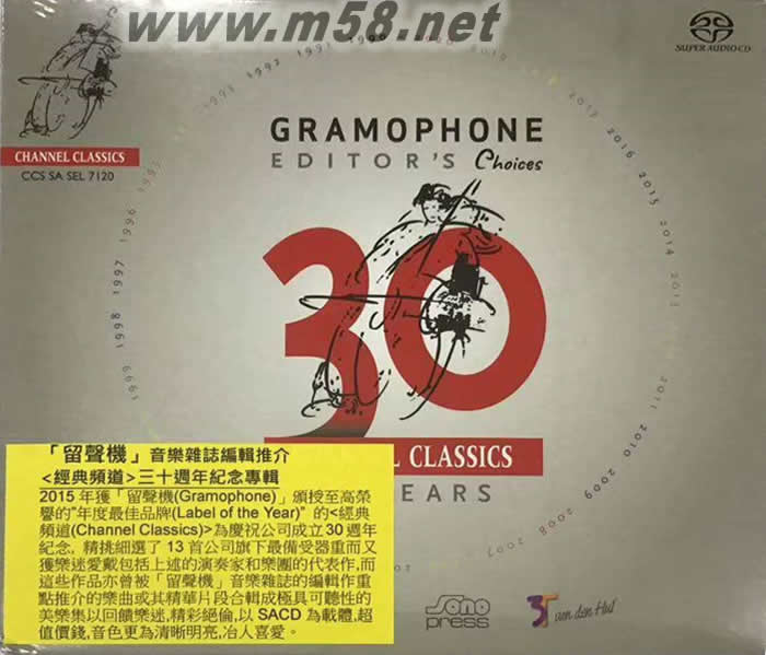 留聲機推介 經典頻道 三年紀念專輯 SACD(m58.net) . 於1990年由著名錄音工程司亞雷德.薩克斯(Jared Sacks)在荷蘭荷溫津(Herwijnen)成立的著名古典音樂製作公司「經典頻道(Channel Classics)」不經不覺已經三十年,在此悠長歲月當中薩克斯以驚人的毅力,對宣傳和推廣古典音樂不遺余力,充滿熱情,加上擁有顯赫的錄音技術,期間曾製作出多個令人回味無窮的經典專輯,獲得多個國際重要音樂奬項,更在2015年獲得權威音樂雜誌「留聲機(Gramophone)」頒授至高榮譽的「年度最佳品牌(Label of the Year)」,可謂實至名歸。 2. 薩克斯曾與多個國際知名樂團、樂隊、指揮、演奏家和聲樂家製作錄音專輯,協助和營造更多機會予他們增加演出經驗和提升他們的表演水平,這包括被「留聲機」音樂雜誌推許為世界十大樂團之一,由指揮大師 伊凡.費沙爾(Ivan Fischer)領導的布達佩斯節日樂團(Budapest Festival Orchestra)、「"留聲機"2018年度藝術家(Gramophone Artist of the Year 2018)」大獎的蕾切爾.普捷(Rachel Podger)、年青小提琴家寧峰和羅珊.菲力彭絲(Rosanne Philippens)、鋼琴家保羅.詹高馬蒂(Paolo Giacometti)和烏克蘭新星安娜.費多羅娃(Anna Fedorova)、大提琴天王彼得.威斯帕維(Pieter Wispelwey)和新彗星里克.史托蒂恩(Rick Stotijn)、阿姆斯特丹小交響樂團(Amsterdam Sinfonietta)和“荷蘭巴哈合唱及管弦樂團(The Netheralnds Bach Society)等,可謂是星光熠熠,令人注目。 3. 為慶祝公司成立三十週年紀念,「經典頻道」在已出版了的四百三十五個錄音專輯中精挑細選了十三首公司旗下最備受器重而又獲樂迷愛戴包括上述的演奏家和樂團的代表作,而這些作品亦曾被「留聲機」音樂雜誌的編輯作重點推介的樂曲或其精華片段合輯成極具可聽性的美樂集以回饋樂迷,精彩絕倫。 4. 被挑選的樂曲屬不同音樂類型,內容豐富充實,每首曲目均各具特色,絕對能滿足古典音樂及「發燒」樂迷的慾望。加上以SACD為載體,音色更為清晰明亮,冶人喜愛。