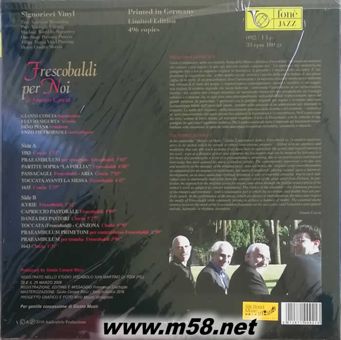 詹尼科夏[向我們的弗科保爾迪致敬] Gianni Coscia [Frescobaldi Per Noi 爵士四重奏 手風琴 大提琴、長號、小號 黑膠專輯背面圖片