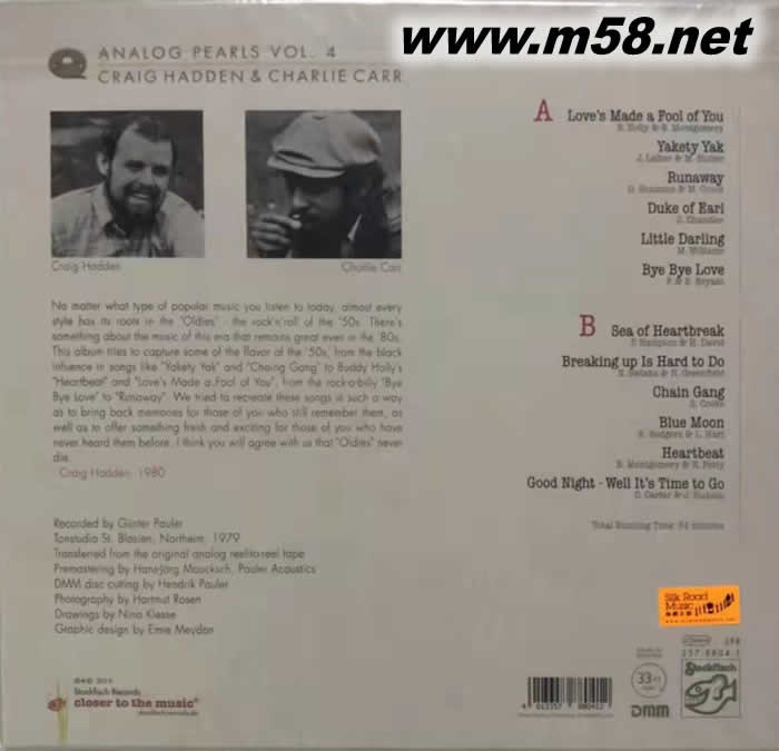 模擬的魅力「黑珍珠」系列第四輯 Analog Pearls Vol. 4 [Old Gold] Craig Hadden & Charlie Carr 黑膠(m58.net) Craig Hadden (男聲)、Charlie Carr (男聲) 1. 上世紀六、七十年代流行樂壇實力派歌手克雷格‧哈登(Craig Hadden)以擅長演唱長青經典流行曲而備受當時特別在歐洲的樂迷歡迎,他的演唱風格是正宗的《樂與怒(rock 'n roll)》,加以他的聲線清脆悅耳,演繹這些歌曲別具韻味。