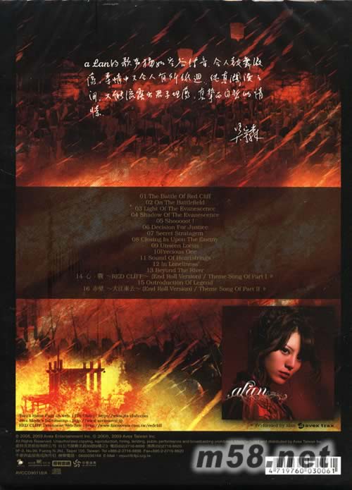 赤壁 決戰(zhàn)天下 CD原聲(m58.net) 終極爭霸稱英雄 大江東去唱千古 吳宇森再創(chuàng)亞洲華語影壇熱賣史詩巨作 日本配樂在師生巖代太郎精心打造 美人美聲新歌姬ALAN絕好獻聲