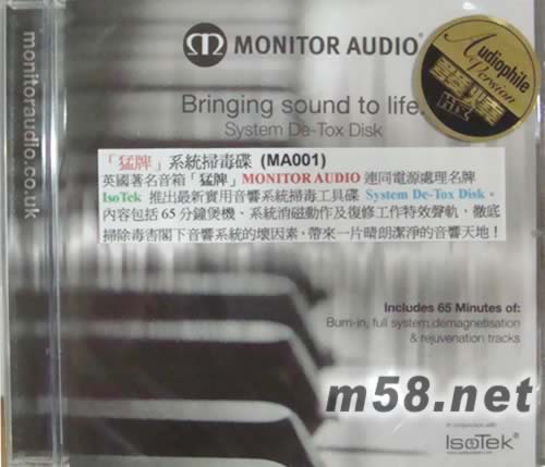 猛牌 音響系統掃毒碟(英國版)(m58.net) [猛牌]系統掃毒(MA001) 英國著名音響[猛牌]MONITOR AUDIO連同電源處理名牌ISO TEK推出最新實用音響系統掃毒工具碟Syetem de-tox disk. 內容包括65分鐘煲機,系統消磁動作及修復工作特效聲軌,徹底掃除毒害閣下音響系統的壞因素,帶來一片晴朗潔凈的音響天地!