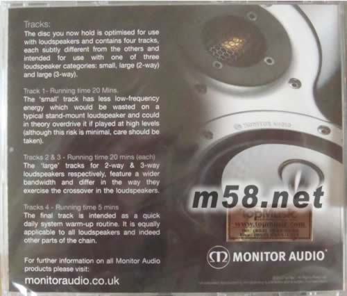 Tracks: the disc you now hold is optimised for use with loudspeakers and contains four tacks,each subtly different from the others and intended for use with one of three loudspeaker categories:small,large(2-way)and large(3-way) Tracks 1-Running time 20 mins. the 'small'tracd has less low-frequency energy which would be wased on a typical stand-mount loudspeaker and could in theory overdrive it if played at hith levels(although this risk is minimal.care should be taken). Tracks 2 & 3-Running time 20 mins(each) the 'large' for 2-way & 3-way loudspeakers respectively,feature a wider bandwidth and differ in the way they exercise crossover in the loudspeakers Tracks 4-Running time 5 mins the final track is intended as a quick daily system warm-up routine.it is equally applicable to all loudspeakers and indeed other parts of the chain