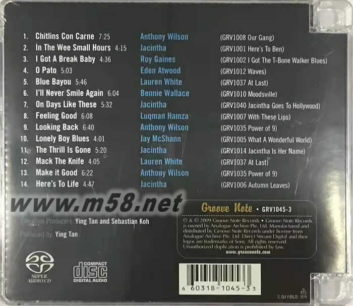 1. In the Wee Small Hours - Jacintha 2. I'll Never Smile Again - Bennie Wallace 3. I Got a Break Baby - Roy Gaines 4. O Pato - Eden Atwood ** 5. Blue Bayou - Lauren White 6. Chitlins Con Carne - Anthony Wilson 7. On Days Like These - Jacintha 8. Feeling Good - Luqman Hamza 9. Looking Back - Anthony Wilson 10.Lonely Boy Blues - Jay McShann 11.The Thrill Is Gone - Jacintha ** 12.Serenata - Eden Atwood ** 13.The Way You Look Tonight - Bill Cunliffe 14.Mack The Knife - Lauren White 15.Make It Good - Anthony Wilson 16.Here's To Life - Jacintha # Stereo and Multichannel
