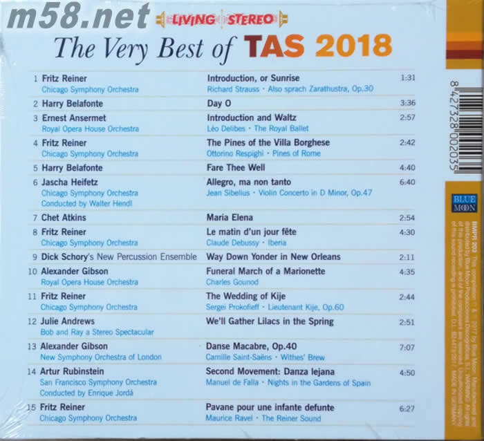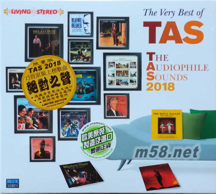 The Very Best of TAS 2018 (絕對之聲)(m58.net) Superior Audiophile Demonstration Compact Disc 西班牙藍月亮Blue Moon,繼成功專集『The Blue Moon Sounds 藍月之聲』1和2后,2018年全力製作,精心挑選15張TAS真正上榜天碟,抽選最佳歌曲,由模擬母帶製作,德國印碟。年度重點專集,藍月亮旗下爆棚精選,加上最強之製作人,最先進設備,把重播音效推上一層,帶出無可比擬之發燒景界,本年度示范級完美天碟!限量發售。