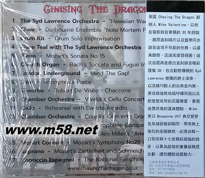 追龍之樂(lè)CHASING THE DRAGON 2 - 滴水 2 直刻CD(m58.net) 英國(guó)直刻錄音名廠二次帶來(lái)重磅級(jí)超值鉅獻(xiàn),大規(guī)模收錄人聲爵士室內(nèi)交響各類樂(lè)曲! ★ 錄音過(guò)程從頭到尾一刀未剪,臨場(chǎng)感破表! ★ Neumann U47 古董管麥?zhǔn)耙簦羯己瘢?br> 英國(guó) Chasing The Dragon 追龍之樂(lè)絕對(duì)是近年來(lái)最受人矚目的發(fā)燒傳奇。創(chuàng)辦人 Mike Valentine 以他在電影錄音累積的 30 年經(jīng)驗(yàn),破天荒展開(kāi)直刻唱片以及盤帶同步錄音這項(xiàng)不可能的任務(wù)。因?yàn)橹笨坛唤?jīng)混音處理,數(shù)量稀少,而聽(tīng)感逼真,讓追龍迅速風(fēng)靡世界! 這次追龍?jiān)俣韧瞥鲋笨啼浺艟蕝R集CD,以饗樂(lè)迷。本片收錄場(chǎng)面熱烈、動(dòng)態(tài)爆棚的 Syd Lawrence 樂(lè)團(tuán)的爵士演奏,以及精巧動(dòng)人的古典室內(nèi)樂(lè),一刀未剪,帶來(lái)一鏡到底的暢快,更收錄倫敦地鐵呼嘯而過(guò)以及教堂管風(fēng)琴的莊嚴(yán)聲響,重現(xiàn)身歷其境的逼真體驗(yàn)。 Mike 更以 Neumanne U47 真空管麥克風(fēng)捕捉精彩瞬間,帶來(lái)無(wú)上愉悅的美麗聽(tīng)感。此張合輯一口氣收錄十七首精彩絕倫的錄音,以最為超值的重量級(jí)精選企劃,讓您體驗(yàn)追龍錄音無(wú)可取代的快感。