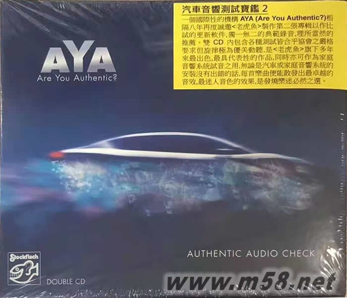AYA是一個國際性的機構,其會員全是嚴格追求正宗、真實和自然聲音的發燒友,特別是在他們的汽車內安裝了精巧的音響設備,以便他們在駕駛時能盡享聆聽美樂的樂趣。這機構亦舉辦一些音效比賽,評判團成員全是音響界和科技界最具影響力的專業人士,而參賽者亦是行內優秀的從業員。在比賽期內,他們對追求純凈自然音效的理想和製作過程的經驗互相交流,不問比賽成績,亦不渴求商業利益,目的只是希望能找到真正的自然美樂。 2. 這比試的評估和檢定非常嚴格,比試系統的功能和質素包括(1) 超低音部由0-45Hz; (2) 低音部由45-120Hz; (3) 基本部由120-250Hz; (4) 中音部由250Hz-3KHz和 (5) 高音部由3KHz或以上,而提供測試的鑑聽盤基本上是完美無瑕,製作者必定是錄音專業界公認的翹楚人物,處領導地位,而「老虎魚(Stockfisch Records)」榮幸地於2011年被委任為此比賽採用的鑑聽盤首張的錄音製作被譽為音質清晰厚實,線條分明,定位精確,每首歌曲無論是音樂或是音效皆是正宗、高規格、有內涵、純正精鏈,是這項聲音系統比試採用的音樂軟件不二之選。AYA這組織於八年之后再度誠邀「老虎魚」製作第二張專輯以作比試的更新軟件,獨一無二的典范錄音,理所當然的推薦。 3. 這專輯含兩張CD,以下是每首樂曲可用作測試的用途: (a) 第一張CD第四至第十六首歌 - 分別用作測試音響裝置的上述五個音部的音調是否精準和其表現水 平。 (b) 第一張CD第十七及十八首歌 - 適合用作比較不同頻率區域的相互影響,判斷多聲道系統的分隔和相位反應以及測試播放聲音的真實性, (c) 第二張CD第一首歌 - 這是樂隊在錄音室的演出,一套好的音響系統能清晰地聽到錄音室的空間深度,每一樂手的位置和立體的音像輪廓。 (d) 第二張CD第二首歌 - 樂手在空曠的半圓型舞臺由最右邊一面擊鼓,一面移動至最左邊,舞臺的深闊度較難分析清楚,只有良好的系統才能分辨出鼓是在臺上那一個方向響起。 (e) 第二張CD第三首歌 - 音樂人在臺上演出時常作移動位置,所有聲音應該保持同一高度,在重播這些聲音時最理想的高度是聽者眼睛的水平,而低音音域都是置放於最前面。 (f) 第二張CD第十首歌 - 圓筒形音樂盒的演奏是用作測試系統的動態由74到84dB/A在那一低音量部份重播不到。 (g) 第二張CD第十一首歌 - 晶瑩剔透的鋼琴琴音和清澈淳厚的女聲歌唱是考驗系統的音效是否清晰透徹,堅實有勁。 (h) 第二張CD第十二首歌 - 乾凈清脆的結他演奏和純美自然的女聲是用作測試系統的解像度,重播的聲音一定要輕鬆自然,微弱細節也能清晰顯現。 (i) 第二張CD第十三首歌 - 豎琴較為乾涸索然的音色,中低音弦擺動時間較長的特色是用作衡量器材系統的解像能力是否出色, 即使最細微的聲音細節和變化也能清楚地聽到,才是標準的裝置。 (j) 第二張CD第十五及第十六首歌 - 大型管弦樂團的演奏,每一種樂器演奏的聲音,獨唱及和聲合唱團的位置、量綱和音色都需一一清楚展現才能定為合格水平。 (k) 第二張CD第十七首歌 - 聆聽這首歌最理想的音量是84dB/A,低、中、及高音頻的音源最為圓潤融合,如果系統播放出的聲音有過度粗獷或沙啞的感覺,那表示這套裝置不適宜採用高音量播放音樂。 (l) 第二張CD第十八至第二十一首歌 - 這幾首歌是需你用自己的耳朵作評估音響裝置系統各方面的音感和效果,每首歌由頭至尾細致地聆聽便能辨別系統的表現和效能。4. 上述各種測試皆合乎協會之嚴格要求但旋律極為優美動聽,是「老虎魚」旗下多年來最出色,最具代表性的作品,同時亦可作為家庭音響系統試音之用,無論是汽車或家庭音響系統的安裝沒有出錯的話,每首樂曲便能散發出最卓越的音效,最迷人音色的效果,是發燒樂迷必然之選。