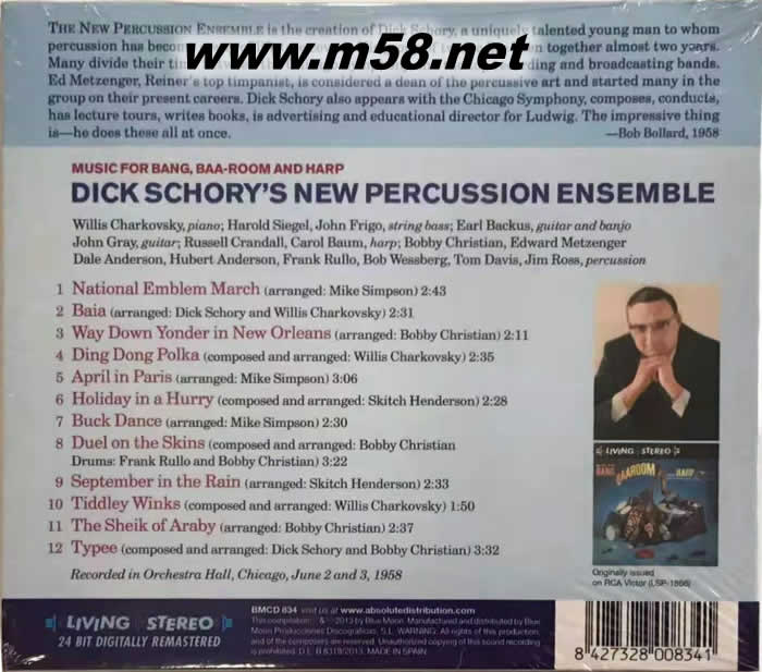 敲擊之王 Music for Bang Baa Room and Harp 立體聲名盤(TAS專業(yè)推介發(fā)燒名盤)(m58.net) Dick Schory – Music for Bang, Baa-Room and Harp (敲擊之王) TAS上榜名盤,更是最佳流行作品十大之一,與Casino Royale、Belafonte at Carnegie Hall、Dark side of the Moon等等齊名。Dick Schory被稱謂敲擊之王,實(shí)至名歸、當(dāng)之無愧。他首先是一個(gè)敲擊樂手,后與芝加哥交響樂團(tuán)合作,他做爵士樂,更懂得敲打流行音樂和實(shí)驗(yàn)音樂。當(dāng)然古典與流行敲擊樂演奏上的影響力,更是他對(duì)世界最大之貢獻(xiàn)。在20世紀(jì)50至60年代,他做了10多張作品,他的音樂一直潛藏在許多敲擊樂手內(nèi)心,影響深遠(yuǎn)。在1958年,他製作了震撼全球?qū)]婱usic for Bang, Baa-Room And Harp (敲擊之王),論演繹和錄音效果,空氣感豐滿的敲擊之王,活靈活現(xiàn),讓人一聽再聽,百聽不厭。精準(zhǔn)無誤之定位,舞臺(tái)型態(tài)大小,無遮無掩。不僅前后左右立體分明,各種樂器逼真;盡現(xiàn)眼前,一覽無遺。強(qiáng)勁音效地動(dòng)山搖,所向披靡,弱音更是纖毫畢現(xiàn),表現(xiàn)人前;是品嚐或試機(jī)的不二之選。