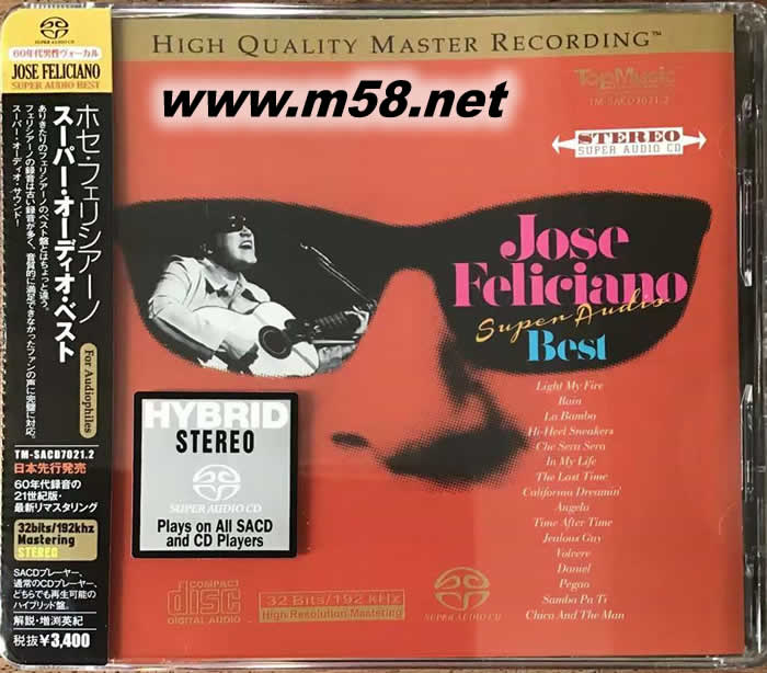 超級音樂與音響 Super Audio Best SACD(m58.net) 拉丁樂壇家喻戶曉的盲眼民謠吉他才子,二度榮獲葛萊美,精湛吉他與嘹亮歌聲魅力不可擋! ★ 專輯中結合熱情與浪漫,為名曲增添全新風貌! ★ Top Music發燒製作,優異音質重現歌手魅力! 荷西弗里西安諾是當今樂團最受推崇、最具代表性的拉丁吉他歌手之一。1945 年出生於波多黎各的他,因為先天性青光眼而失明。然而,喪失視力反而讓他更早開啟音樂天賦,幼年時期開始學習手風琴,九歲便開始在紐約波多黎各劇院演奏。十二歲時,他從爸爸手中獲得吉他,便能靠聆聽各類曲風自學彈奏,奠定了他獨特的演奏風格。 與巴布狄倫及瓊拜雅同時發跡的他,獲得 RCA 公司注意而成為旗下簽約藝人,並以拉丁風格重新詮釋門戶合唱團的〈Light My Fire〉在各國排行榜創下驚人佳績。1970 年,再度以《圣誕快樂》專輯創下銷售巔峰,同名單曲不但翻唱無數,更成為美國每年圣誕必播歌曲。本精選集收錄他當年的成名演奏以及翻唱歌曲,融合拉丁的熱情以及輕音樂的浪漫,展現出不拘一格的音樂才華,透過 Top Music 的母帶重製,音質發燒,更具魅力。