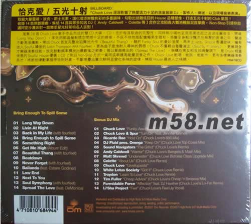 五光十射 CHUCK LOVE(m58.net) 『Chuck Love深深影響了熱愛活力十足的浩室音樂DJ、製作人、樂迷、以及現場音樂表演』– BILLBOARD @OM Records旗下當家DJ,取掘大量靈魂、放克甚至爵士元素,追尋時興以及復古多重韻味,勾勒出迷離眩目的當代House品種塑像,打造五光十射的Club氣氛! @CD1忠於每首歌曲的完整性,同時無冷場的呈現高潮迭起之波波炫麗音浪,CD2則集結與眾多知名DJ﹝Andy Caldwell、Colette等﹞合作之攻陷各大舞池暢銷混音單曲,Non-Stop引領你自邁阿密沙灘派對一路舞至星光好萊塢派對! @蒐集攻陷各舞池〈Beautiful Thang〉、〈Soul Symphony〉、〈Spread The Love〉等暢銷之作 沾染一身Disco House風采,誘發入夜后舞池火辣起舞悸動,舊金山電子樂派大廠OM Records旗下當家DJ Chuck Love,勾勒出迷離炫目的當代House品種塑像。取掘大量靈魂、放克甚至爵士元素,譜化增添鮮艷色彩,追尋時興以及復古多重韻味,打造五光十射的Club氣氛。 蒐集28首Chuck Love拿手作品而成的雙CD大碟《Bring Enough To Spill Some》,CD1忠於每首歌曲的完整性,同時無冷場地呈現高潮迭起之波波炫麗音浪,開場的〈Long Way Down〉,率先用那晶瑩剔透空間感十足的線條,不疾不徐的搭配慵懶男生唱和,感覺全身輕浮飄流在無壓的音場之中;聲波不斷高漲擴散,帶出Chuck首支完整攻陷舞池大作〈Beautiful Thang〉,融於Funky Soul的曼妙滋潤,再淋下Jazzy Groove香濃甜味,擁有迷人Soulful嗓音的Justin Thompson AKA Fourfeet,更為曲子宣洩耐人尋味的質感;Chuck不僅親自發聲演出〈Soul Symphony〉,更展現全才樂器演奏技能,巧妙拼入吉他、長笛、小號、打擊樂器…等等音源,放克鼓動頻率釋放出最歡愉之節奏;曾以單曲推出的〈Spread The Love〉,架構在男女相互共鳴聲調下,是Chuck相當得意的Soulful House優選;CD2則以Non-Stop方式一氣呵成串連高能量混音之作。Chuck Love能唱、能跳、能創作、更有多樣樂器演奏長才,將節拍律動掌握得恰到好處,捨棄那些單一變化性小的節奏,不斷堆疊出層次鮮明且變化多端的旋律,捕捉House最迷人之精髓。