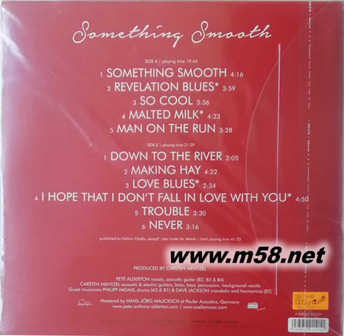 SOMETHING SMOOTH (男聲與吉它) 黑膠(m58.net) Pete Alderton (男聲, 結他) Carsten Mentzel (結他,低音結他,琴鍵,敲擊, 來自英國的彼特‧艾爾德頓藍調唱腔渾然天成,低沈而充滿磁性,粗獷卻不粗糙,不用刻意矯情,就能散發無比強烈的感染力,更重要的是,他有本事為經典藍調注入新生命。聽他翻唱早期草根藍調大師Robert Johnson的Walking Blues,濃郁的密西西比藍調原味頓時流泄,卻一點也沒有陳舊氣息。Help Me涌進的藍調音階,考驗著歌者的藍調唱功,別人需要刻意揣摩的藍調韻味,彼特彷彿隨口哼唱就能抓住神髓。Georgia On My Mind翻唱者不計其數,但是能像彼特這般唱得輕鬆坦然者卻不多。詮釋另一首經典Summertime,彼特換上輕快節拍,沒想到卻產生了不可思議的化學變化,為這首老歌增添時尚現代感。專輯同名創作曲Cover My Blues淡淡的感傷氛圍令人著迷。製作人兼吉他手Carsten Mentzel不落俗套的演奏是專輯另一個焦點,優異的錄音更令人驚艷。