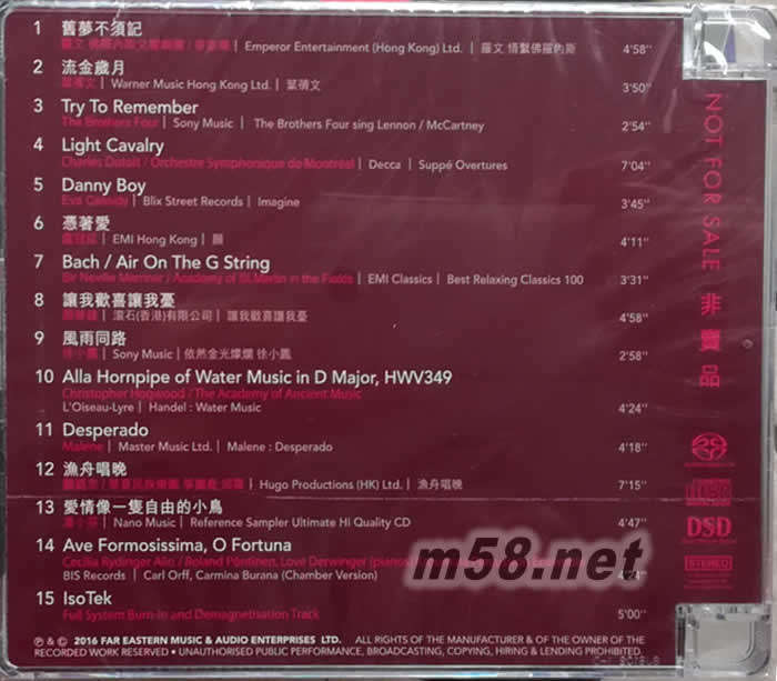 01. 舊夢不須記 02. 流金歲月 03. Try To Remember 04. Light Cavairy 05. Danny Boy 06. 憑著愛 07. Bach Air On The G String 08. 讓我歡喜讓我憂 09. 風雨同路 10. Alla Hompipe of Water Music in D M aior Hwv 11. Desperado 12. 漁舟唱晚 13. 愛情像一只自由的小鳥 14. Ave Formosissima O Fortuna 15. lso Tek