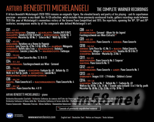 THE COMPLETE WARNER RECORDINGS 14CD套裝(m58.net) 意大利鋼琴家,10歲進米蘭音樂學院師從安福西學鋼琴,1933年畢業,1939年參加日內瓦國際鋼琴比賽獲一等獎后,波洛尼亞的馬蒂尼音樂學院聘他當鋼琴教授.二次大戰中參軍任意大利飛行員,曾成為德軍的俘虜,后又戲劇性地逃脫.二次大戰結束后,米凱蘭杰利開始巡回演出,在各地引起轟動,1952年因患病不得不中斷巡回演出,在意大利幾個城市舉辦鋼琴高級班.1964-1969年創辦一所鋼琴天才學校,專收世界各國最有才能的學生.1968年,他移居瑞士.米凱蘭杰利是一個完美主義者,他對音色十分在意,沒有人能奏出比他更完美的圓滑音階、更響亮、有力的和弦或以更精致的觸鍵與音調呈現更平衡的結構.他追求的是"管風琴和小提琴相結合"的那種音色,他又是公認的"音樂哲學家",每一首曲子的演繹都有獨到的曲速安排與分句設計.米凱蘭杰利因為對演奏的效果的苛求,留下的唱片并不多,他的貝多芬的皇帝協奏曲是一生所有精髓的極至;他的德彪西展現出了頂尖絕妙的音色與層次;他的肖邦也是最有味道的肖邦.應該說,他錄制的每一首作品,都呈現著別人難以企及的精致.