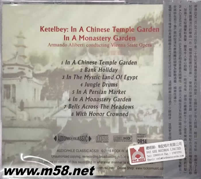 中國寺廟花園 - 虎豹別墅(鋼琴)In a Chinese Temple-Garden HDCD(m58.net) 虎豹別墅 發燒奇碟 .上世紀初英國最暢銷作曲家卻德比KETELBEY .百萬銷路作品齊集 .超天版級錄音 .全球首度發行CD 卻德比KETELBEY百分百不是二十世紀英國最受敬重的作曲家 ,在國外更少有人認識 ,剛好一百年前 ,他創作了上世紀初英國最流行的樂曲[在一個修道院裡的花園] ,樂曲的旋律簡單易聽 ,但在樂器運用和配合方面卻極其豐富巧妙 ,加插了寺院鐘聲和鳥聲 ,聽落令人身心舒暢 ,一曲成名後 ,卻德比繼續創作了不少優秀樂曲 ,其中的[虎豹別墅]IN A CHINESE TEMPLE GARDEN相信是最具娛樂性 , 卻德比大概從沒有到中國或香港 , 創作這首樂曲完全斷估,妙就妙在那不倫不類的旋律和樂器編排卻極為動聽過癮 ,娛樂性滿分 這個1963年錄音由美國細廠WESTMINISTER出版 ,這間細廠出版過不少靚錄音 ,這個更是超天碟級數 上世紀初英國暢銷作曲家卻德比KETELBEY .百萬銷路作品齊集 .超天版級錄音 全球首度發行CD ,卻德比KETELBEY百分百不是二十世紀英國最受敬重的作曲家,在國外更少有人認識,剛好一百年前,他創作了上世紀初英國最流行的樂曲(在一個修道院里的花園),樂曲的旋律簡單易聽,但在樂器運用和配合方面卻極其豐富巧妙,加插了寺院鐘聲和鳥聲,聽落令人身心舒暢,一曲成名后,卻德比繼續創作了不少優秀樂曲,其中的虎豹別墅 IN A CHINESE TEMPLE GARDEN相信是最具娛樂性,卻德比大概從沒有到中國或香港,創作這首樂曲完全斷估,妙就妙在那不倫不類的旋律和樂器編排卻極為動聽過癮,娛樂性滿分這個1963年錄音由美國細廠WESTMINISTER出版,這間細廠出版過不少靚錄音,這個更少超天碟級數