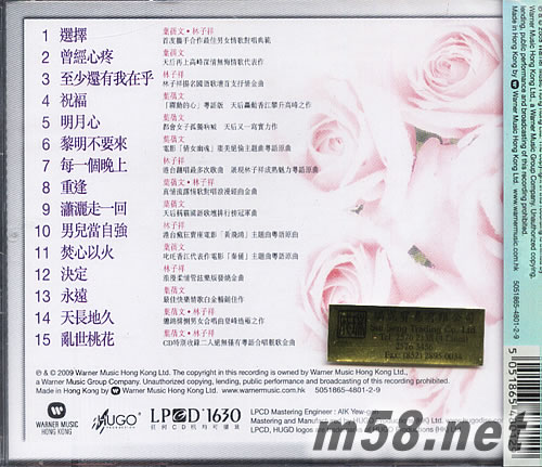 1、選擇 2、曾經心疼 3、至少還有我在乎 4、祝福 5、明月心 6、黎明不要來 7、每一個晚上 8、重逢 9、瀟灑走一回 10、男兒當自強 11、焚心似火 12、決定 13、永遠 14、天長地久 15、亂世桃花