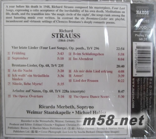 01 4 Letzte Lieder (4 Last Songs), TrV 296: No. 1. Fruhling Michael Halasz 02 4 Letzte Lieder (4 Last Songs), TrV 296: No. 2. September Michael Halasz 03 4 Letzte Lieder (4 Last Songs), TrV 296: No. 3. Beim Schlafengehen Michael Halasz 04 4 Letzte Lieder (4 Last Songs), TrV 296: No. 4. Im Abendrot Michael Halasz 05 6 Lieder, Op. 68, TrV 235: No. 1. An die Nacht Michael Halasz 06 6 Lieder, Op. 68, TrV 235: No. 2. Ich wollt' ein Strausslein binden Michael Halasz 07 6 Lieder, Op. 68, TrV 235: No. 3. Sausle, liebe Myrte! Michael Halasz 08 6 Lieder, Op. 68, TrV 235: No. 4. Als mir dein Lied erklang Michael Halasz 09 6 Lieder, Op. 68, TrV 235: No. 5. Amor! Michael Halasz 10 6 Lieder, Op. 68, TrV 235: No. 6. Lied der Frauen Michael Halasz 11 Ariadne auf Naxos, Op. 60, TrV 228a (excerpts): The Opera: Overture Michael Halasz 12 Ariadne auf Naxos, Op. 60, TrV 228a (excerpts): The Opera: Dance Scene Michael Halasz