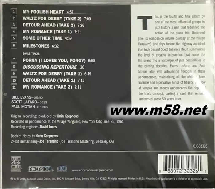 1. My Foolish Heart 2. Waltz For Debby (Take 2) 3. Detour Ahead (Take 2) 4. My Romance (Take 1) 5. Some Other Time 6. Milestones 【BONUS TRACKS】 7. Porgy (I Loves You Porgy) (Outtake) 8. Discussing Repertoire 9. Waltz For Debby (Take 1) 10. Detour Ahead (Take 1) 11. My Romance (Take 2)