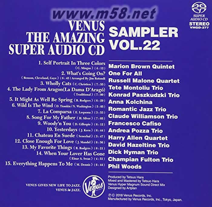 價格為估,以實到貨為準! 夢幻發燒試碟王 22 VENUS THE AMAZING Super Audio CD SAMPLER VOL.22 (限量單層SACD)(m58.net) 日本著名發燒爵士品牌Venus Records選輯旗下十五首超正錄音,多位音樂名家及歌手分別演繹多首名曲如:等,多位名家的精彩演出帶來了永恒的經典金曲,以單層SACD推出,這個備受發燒友及音響界推崇的制式提供如在現場欣賞的靚絕音效。原裝日本豪華厚紙限量版。(只能以SACD機播放)