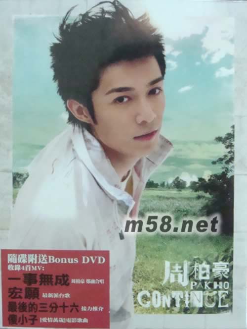 Continue(m58.net) 創作偶像歌手"周柏豪",2008年全新專輯CD + Bonus DVD,全城熱烈期待上市 與 鄭融 合唱 熱播流行歌曲: 一事無成 - 各電臺媒體播出后得到全面好評 第一主打 儍小子 - 電影 [愛情萬歲] 主題曲 特別介紹: 宏愿 - 第二首重點主打之作 特別推薦: 全碟所有歌曲及MV