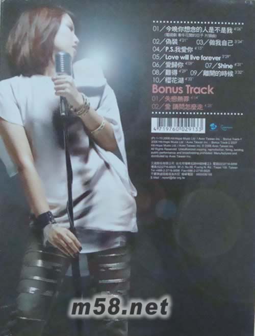 1. 今晚你想念的人是不是我 2. 偽裝 3. 做我自己 4. P.S.我愛你 5. Love will live forever 6. 愛歸你 7. Shine 8. 難得 9. 離開的時候 10. 櫻花湖 11. 失戀無罪 12. 請問愛怎麼走