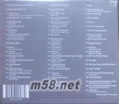 DISK 1 CD 1 Sue (Or In A Season Of Crime) David Bowie 7:23 2. Where Are We Now? David Bowie 4:08 3. Love Is Lost (Hello Steve Reich Mix by James Murphy for the DFA Edit) David Bowie 4:07 4. The Stars (Are Out Tonight) David Bowie 3:54 5. New Killer Star (Radio Edit) David Bowie 3:44 6. Everyone Says `Hi` (Edit) David Bowie 3:29 7. Slow Burn (Edit) David Bowie 3:57 8. Let Me Sleep Beside You David Bowie 3:13 9. Your Turn To Drive David Bowie 4:53 10. Shadow Man David Bowie 4:45 11. Seven (Marius De Vries Mix) David Bowie 4:11 12. Survive (Marius De Vries Mix) David Bowie 4:18 13. Thursday`s Child (Radio Edit) David Bowie 4:25 14. I`m Afraid Of Americans (V1) [Radio Edit] David Bowie 4:25 15. Little Wonder (Edit) David Bowie 3:42 16. Hallo Spaceboy (with The Pet Shop Boys) [Pet Shop Boys Remix] David Bowie 4:26 17. The Heart`s Filthy Lesson (Radio Edit) David Bowie 3:33 18. Strangers When We Meet (Single Version) David Bowie 4:20 DISK 2 CD 1. Buddha Of Suburbia (2014 Remastered Version) David Bowie 4:26 2. Jump They Say (Radio Edit) [2014 Remastered Version] David Bowie 3:54 3. Time Will Crawl (MM Remix) David Bowie 4:55 4. Absolute Beginners (Single Version) [2014 Remastered Version] David Bowie 5:35 5. Dancing In The Street (2014 Remastered Version) David Bowie & Mick Jagger 3:10 6. Loving The Alien (Single Remix) [2014 Remastered Version] David Bowie 4:42 7. This Is Not America (with The Pat Metheny Group) [2014 Remastered Version] David Bowie 3:51 8. Blue Jean (2014 Remastered Version) David Bowie 3:11 9. Modern Love (Single Version) [2014 Remastered Version] David Bowie 3:56 10. China Girl (Single Version) [2014 Remastered Version] David Bowie 4:15 11. Let`s Dance (Single Version) [2014 Remastered Version] David Bowie 4:08 12. Fashion (Single Version) [2014 Remastered Version] David Bowie 3:26 13. Scary Monsters (And Super Creeps) [Single Version] (2014 Remastered Version) David Bowie 3:32 14. Ashes To Ashes (Single Version) [2014 Remastered Version] David Bowie 3:36 15. Under Pressure (2011 Remastered Version) Queen and David Bowie 4:10 16. Boys Keep Swinging (2014 Remastered Version) David Bowie 3:17 17. Heroes (Single Version) [2014 Remastered Version] David Bowie 3:33 18. Sound And Vision (2014 Remastered Version) David Bowie 3:03 19. Golden Years (Single Version) [2014 Remastered Version] David Bowie 3:27 20. Wild Is The Wind (2010 Harry Maslin Mix) David Bowie 6:05 DISK 3 CD 1. Fame (2014 Remastered Version) David Bowie 4:16 2. Young Americans (2007 Tony Visconti Mix Single Edit) David Bowie 3:10 3. Diamond Dogs David Bowie 5:50 4. Rebel Rebel (2014 Remastered Version) David Bowie 4:30 5. Sorrow (2013 Remastered Version) David Bowie 2:53 6. Drive-In Saturday (2013 Remastered Version) David Bowie 4:37 7. All The Young Dudes David Bowie 3:08 8. The Jean Genie (Original Single Mix) [2014 Remastered Version] David Bowie 4:05 9. Moonage Daydream (2012 Remastered Version) David Bowie 4:40 10. Ziggy Stardust (2012 Remastered Version) David Bowie 3:13 11. Starman (Original Single Mix) David Bowie 4:12 12. Life On Mars? (2003 Ken Scott Mix) David Bowie 3:48 13. Oh! You Pretty Things (2014 Remastered Version) David Bowie 3:12 14. Changes (2014 Remastered Version) David Bowie 3:35 15. The Man Who Sold The World (2014 Remastered Version) David Bowie 3:57 16. Space Oddity (2009 Remastered Version) David Bowie 5:17 17. In The Heat Of The Morning (Stereo Mix) David Bowie 2:58 18. Silly Boy Blue David Bowie 3:54 19. Can`t Help Thinking About Me David Bowie 2:43 20. You`ve Got a Habit of Leaving (2014 Remastered Version) Davy Jones (And The Lower Third) 2:29 21. Liza Jane Davie Jones and the King Bees 2:16