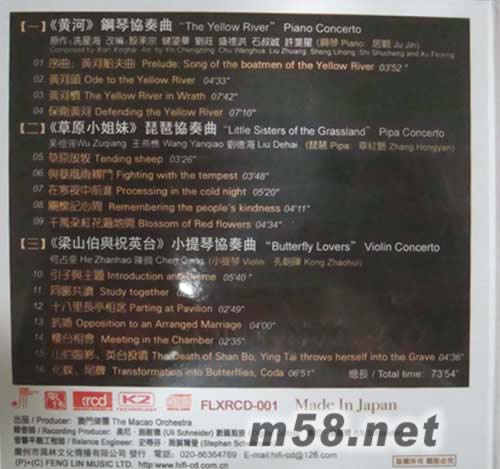 1.序曲:黃河船夫曲 03:52 鋼琴 / Piano:居覲 / Ju Jin 2.黃河頌 04:33 3.黃河憤 07:42 4.保衛(wèi)黃河 07:10 5.草原放牧 03:26 琵琶 / Pipa:章紅艷 / Zhang Hong Yan 6.與暴風(fēng)雨搏斗 03:48 7.在寒夜中前進(jìn) 05:20 8.關(guān)懷記心間 04:11 9.千萬朵紅花遍地開 04:34 10.引子與主題 05:40 小提琴 / Violin:孔朝縡 / Kong Zhao Hui 11.同窗共讀 02:38 12.十八里長亭相送 02:49 13.抗婚 04:00 14.樓臺相會 02:35 15.山伯臨終、英臺投墳 04:36 16.化蝶、尾聲