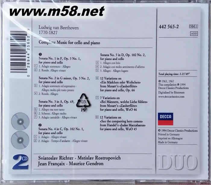 大提琴與鋼琴BEETHOVEN COMPLETE MUSIC FOR CELLO AND PIANO(白色封面雙CD)(m58.net) 羅斯特羅波維奇的《貝多芬:大提琴和鋼琴奏鳴曲全集》,在2009年《企鵝古典唱片指南》中推薦為四星。 貝多芬《大提琴和鋼琴作品全集》不僅被《企鵝唱片指南》評為四星,而且《日本唱片藝術名盤300》也評為權威版本。 貝多芬寫了五首大提琴奏鳴曲,雖然數(shù)量不多,但是卻涵蓋他重要的創(chuàng)作時期。第三號獻給貝多芬的摯友暨大提琴家,年輕的葛萊亨斯坦男爵。羅斯特羅波維奇與Richter的搭檔這一回完成三連霸,羅斯特羅波維奇身為當今大提琴演奏泰斗,此版1961年的決定性演出,獲五位評論員一致的推崇。以總得分24分的優(yōu)異成績稱霸,就算再多的形容詞,也無法形容本版的偉大。第五號與第四號大提琴奏鳴曲一樣都是三樂章的古典形式,曲風呈現(xiàn)晚期圓熟的風韻,與第四號的幽默相比,第五號宗教含意較濃。羅斯特羅波維奇以豐富想像力的自發(fā)思考,揮灑出第五號奏鳴曲的魅力。與Richter細膩的對話,對聽者的誘惑力相當強大。——摘自《唱片圣經(jīng)》 在唱片史上,羅斯特羅波維奇、Richter這兩位大師大師堪稱典范的錄音屬于該套作品的決定性版本,于1963年和1967年以立體聲方式錄音留存于世,Philips再將當年的LP經(jīng)現(xiàn)代數(shù)碼混音改善,于1994年推出雙CD套裝,把這部分名演一次性收錄,更添收藏價值。