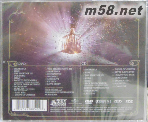CD 01. Sparks Fly 02. Mine 03. The Story of Us 04. Mean 05. Ours 06. Back To December/Apologize/You're Not Sorry 07. Better Than Revenge 08. Speak Now 09. Last Kiss 10. Drops of Jupiter 11. Bette Davis Eyes 12. I Want You Back 13. Dean John 14. Enchanted 15. Haunted 16. Long Live DVD 01. Sparks Fly 02. Mine 03. The Story of Us 04. Our Song 05. Mean 06. Back To December/Apologize/You're Not Sorry 07. Better Than Revenge 08. Speak Now 09. Fearless/I'm Yours/Hey, Soul Sister 10. Last Kiss 11. Drops of Jupiter 12. You Belong With Me 13. Dean John 14. Enchanted 15. Haunted 16. Long Live 17. Fifteen 18. Love Story Bonus Video Content: - Home Movies & Rehearsals of the Speak Now World Tour