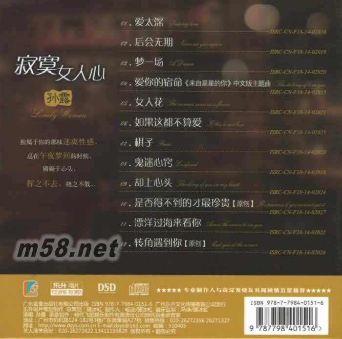 價格為估,以實到貨為準! 寂寞女人心(m58.net) 《 孫露寂寞女人心》年度屏息以待的歌聲——孫露完美唱腔實力咋現“靈魂磁性歌聲,曲編演奏俱佳” 穿透靈魂的磁性女聲 撫慰情殤「靈魂女聲」---絕對是HIFI的“第一誘惑” 是那種發自靈魂最深處的本能誘惑!每一首歌充滿了神奇的誘惑魅力,曲風旋律特色鮮明,令人屏息的純凈完美,展現來自孫露的內心表白,讓你無從 抗拒的魅力女聲,每一把讓人為之動容的動人歌喉,令人無法抗拒的磁性女聲,相信即便是初次傾聽,也難以抵御它的聲色蠱惑,絕對能輕而易舉地俘獲每一位聆聽的心靈!歌聲在我們耳際飄過,那久蓄的情感就會激活我們的心靈,它瞬間打開我們記憶的閘門,帶領我們穿越時空的隧道,喚醒心底最久遠的記憶…… ★專輯選曲制作首首選精敲細磨 量身打造 神曲再現集聆聽與收藏價值于一體的發燒天碟。