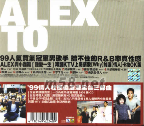 99情人杜德偉(m58.net) 99人氣買氣冠軍男歌手 情歌盟主三周暢銷30萬張不只臺灣溺愛 ALEX進軍日本樂壇首步曲[WHY]中文搶聽版 慶功收錄 新包裝 1+1CD ALEX TO 99情人杜德偉 99全新國語專輯 小蟲音樂制作日本 [五花八門淺草橋]高人氣新秀 小林優美跨國 MTV合作 日本傳媒破天荒衡星追蹤特別企劃 TVBS八點檔 [聊齋]片頭曲 [把你藏起來] 福特TIERRA-LIFE汽車廣告曲[情人] 三立都會臺港劇[真愛]片頭片尾曲[WHY][把你龐壞] 內附L.A寫真POST CARDS 99人氣買氣冠軍男歌手 擋不住的R&B率真性感ALEX與小蟲繼[鐘愛一生]再創KTV上癮情歌[WHY]加送[情人]卡拉OK版 99情人杜德偉浪漫全臺三部曲 [全省預購聽賣會]一日內成功搶鮮預購9900張CD [世紀婚禮大見證]用歌聲祝福60對真愛情人 [中日合作特別企劃]日本[五花八門淺草橋]高人氣新秀小林優美跨國MTV日劇式拍攝 全亞洲放送