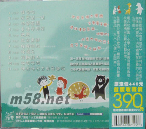 1 哇哈哈 2 尾巴猜一猜 3 快樂家園 4 童話夢想家 5 圈圈 6 微笑黑熊 7 猩猩朋友 (新竹動物園主題曲) 8 檸檬系 9 綠動超人 (響應聯(lián)合國種樹計劃) 10 晚安晚安 11 晚安晚安(古典音樂版)